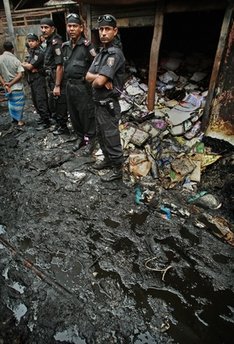 6月4日,孟加拉國安全官員維護(hù)火災(zāi)現(xiàn)場秩序